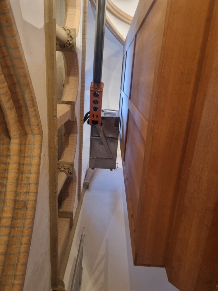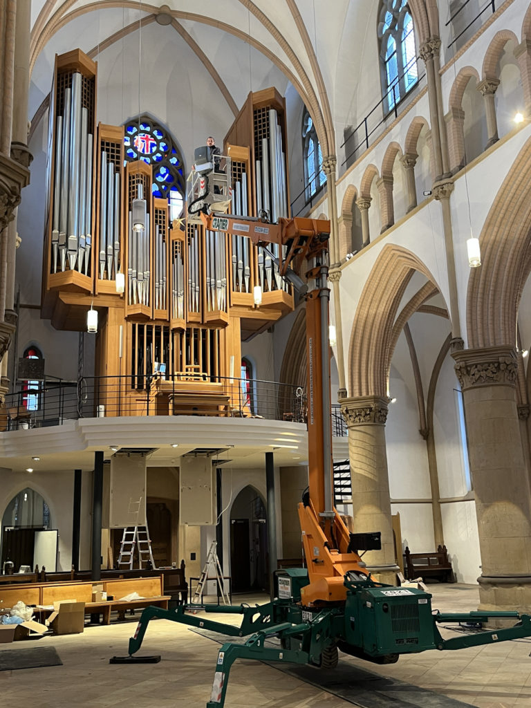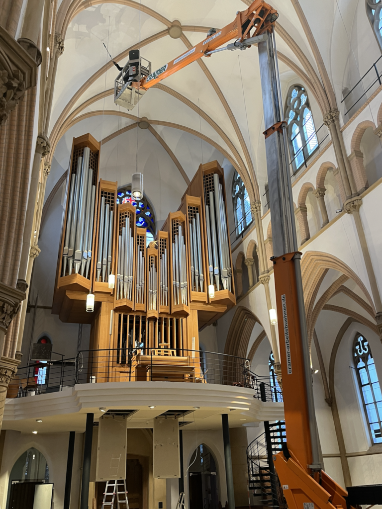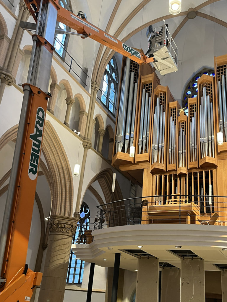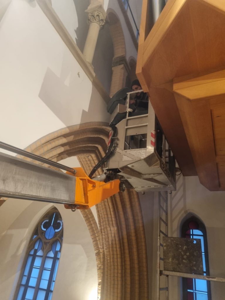 🔸 Schmaler Arbeitskorb: So konnte selbst der enge Bereich zwischen Orgel und Wand problemlos erreicht werden. Ein Einsatz, der zeigt: