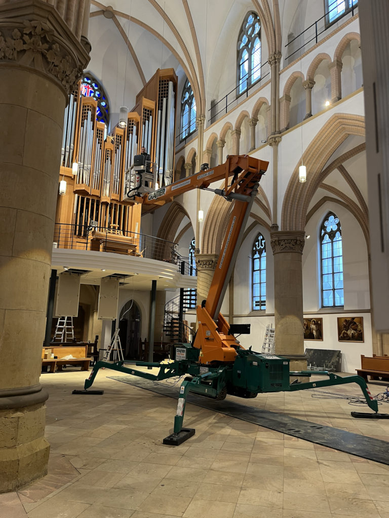 Wenn Technik auf Tradition trifft: Unsere RGT 23 Spinne im Einsatz in einer Kirche mit beeindruckenden 19 Metern Deckenhöhe. Trotz der engen Säulen im Eingangsbereich und der niedrigen Türen konnte die Spinne dank ihrer besonders schmalen Bauweise und der kompakten Gerätehöhe mühelos in den Innenraum gebracht werden.