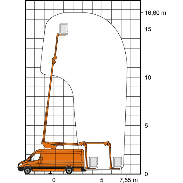 Der Kastenwagen T 17 KA von GSR eignet sich besonders für schnelle und wendige Arbeitseinsätze in bis zu 16,60 Metern Höhe. Mit der cleveren Korbarm-Technik lässt es sich zum Beispiel im fließenden Straßenverkehr sicher und flexibel arbeiten. Ideal für Kommunen zur Wartung von Straßenbeleuchtungen, aber auch für Elektro- und Verkehrsbetriebe und für die Baumpflege ist dieses Modell geeignet.