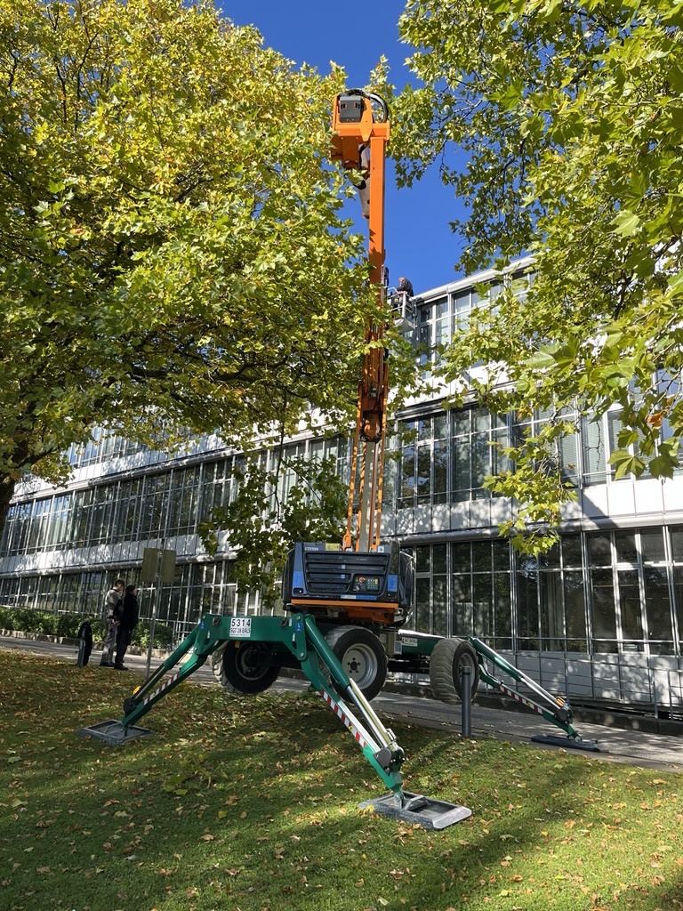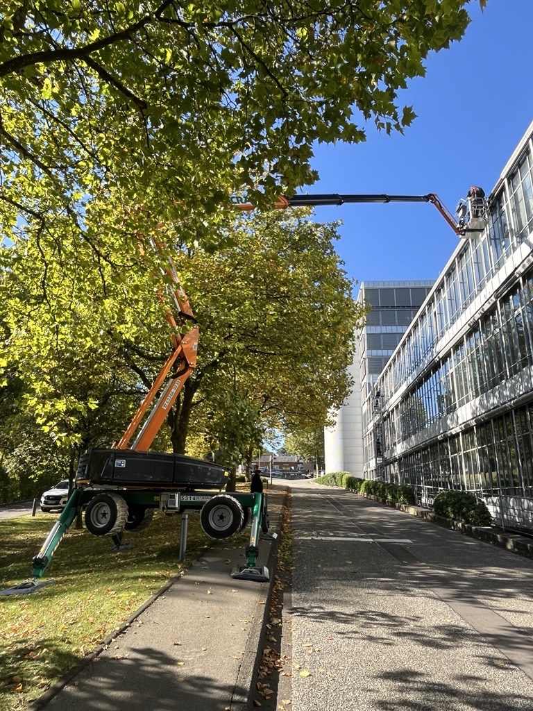 🔧 Aufgabe: Wartung und Reparatur eines Sonnenschutzsystems in 12 m Höhe – und das bei 12 m seitlicher Reichweite.